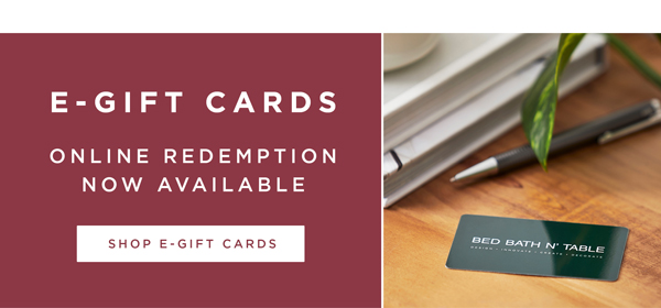Gift Cards | Bed Bath N' Table E-Gift Cards - Bed Bath N' Table . E-Gift Card. E-Gift Cards - Bed Bath N' Table. In stock. SKU. 21001801. Amount Gift Card Information. Sender Name. Sender Email. Recipient Name. Recipient Email. Message. Choose the items that you want to add to your wishlist by adding a quantity. Qty. Add to Bag. FIND IN STORE. Add to Wish List ...